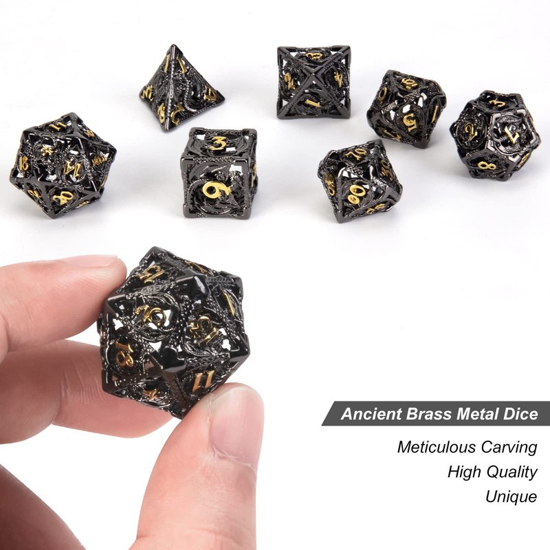DND Dice,Hollow D&D Metal Dice,Dungeons and Dragons Dice Set with Gift Box,7 PCs Steampunk Polyhedral Dice Games Set for RPG,MTG,Pathfinder, (Dragon Black Golden)