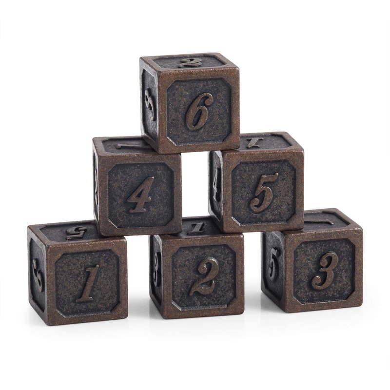 The solid metal set of d6s dice features ancient copper. Amaing and unique set of dice that are easy read and extremely fun to roll. This set of 6 six-sided dice is perfect to add your existing set or utilize for games like dungeons and dragons, pathfinder, of d6 only games like Shadowrun or GURPs. Specification