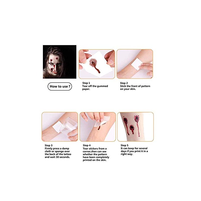 This fake blood tattoos are manufactured with high-quality materials to ensure that the temporary tattoos are not easily peeled off or peeled off, waterproof, can be kept for several days.