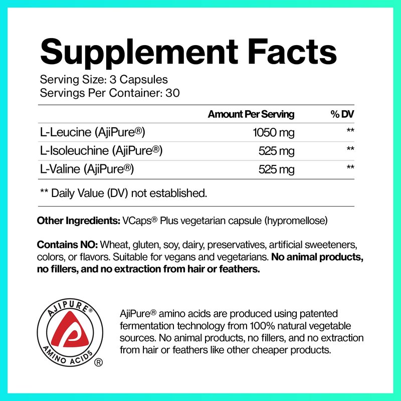 - ENERGY & MUSCLE REPAIR: These Branched Chain Amino Acid Supplement capsules are plant based and have a 2:1:1 ratio of AjiPure essential BCAA L-leucine, L-isoleucine, and L-valine. They help prevent muscle breakdown, encourage muscle recovery, and increase energy and protein synthesis.