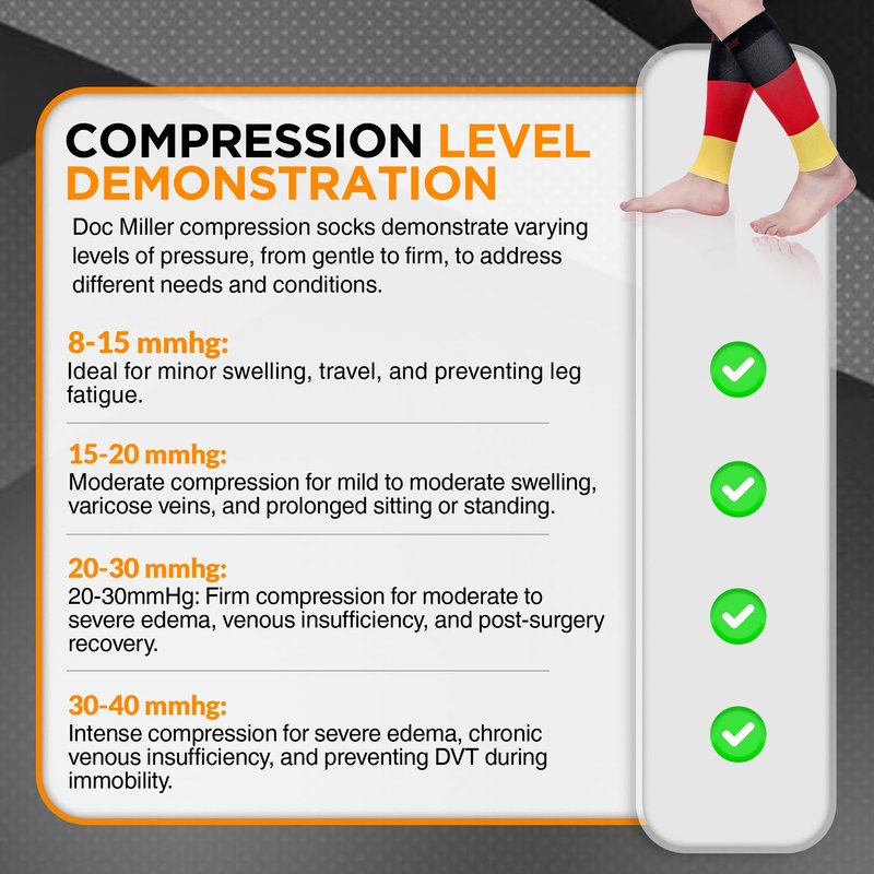 Doc Miller calf compression sleeves for short people men and women with the strength of 15-20mmHg are designed for greater strength than regular calf compression sleeve available. They have a stronger grip for snug fitting that makes quick and fast recovery from tendon and calf injuries. Compression calf sleeves petite men and women are designed for daily use at home or the workplace. Premium quality nylon and spandex fabric is used in the shin splint compression sleeve, for graduated compression of 15-20mmHg, which may provide relief, and recover leg cramps, muscle soreness due to long- standing or sitting job. These footless compression sleeves for men and women are a product for daily use, worn either at work or during sports. These calf sleeves will protect and comfort your legs from shin splints or torn calf muscles. Wear them with confidence and style. We at Doc Miller always strive to provide you with great products that provide the required compression, pain relief, and comfort you are looking for. We have a wide variety of compression socks, you can get knee-high compression socks, thigh high stockings, toeless compression sleeves, elbow braces, ankle sleeves, and calf sleeves in different colors, sizes, plus sizes, compression and patterns.