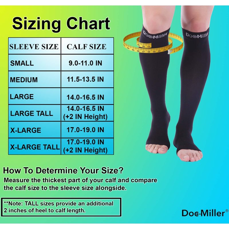 Doc Miller Toeless Compression Socks for Women and Men are designed for recovery from calf, shin splints, varicose veins and foot muscle injuries. These open toe compression socks for men and women may provide pain relief for sore muscles, plantar fasciitis and edema. Premium quality washable nylon and spandex fabric is used for graduated compression, these foot socks are the right choice for pregnant women, nurses, footballers, golfers, gymnastics, policemen, doctors and any other activity that requires active use of legs. These open toe socks have sleek design, which makes them wearable for daily use or for special occasions. Select from a wide range of colors and compression strengths. At Doc Miller we value your money and always strive to provide you great products that provide the required compression, pain relief, results, and comfort you are looking for. We have a wide variety of compression socks - you can get full length compression socks, thigh high stocking, toeless compression sleeves, elbow braces, ankle sleeves, and calf sleeves in different colors, size, plus size, compression and patterns