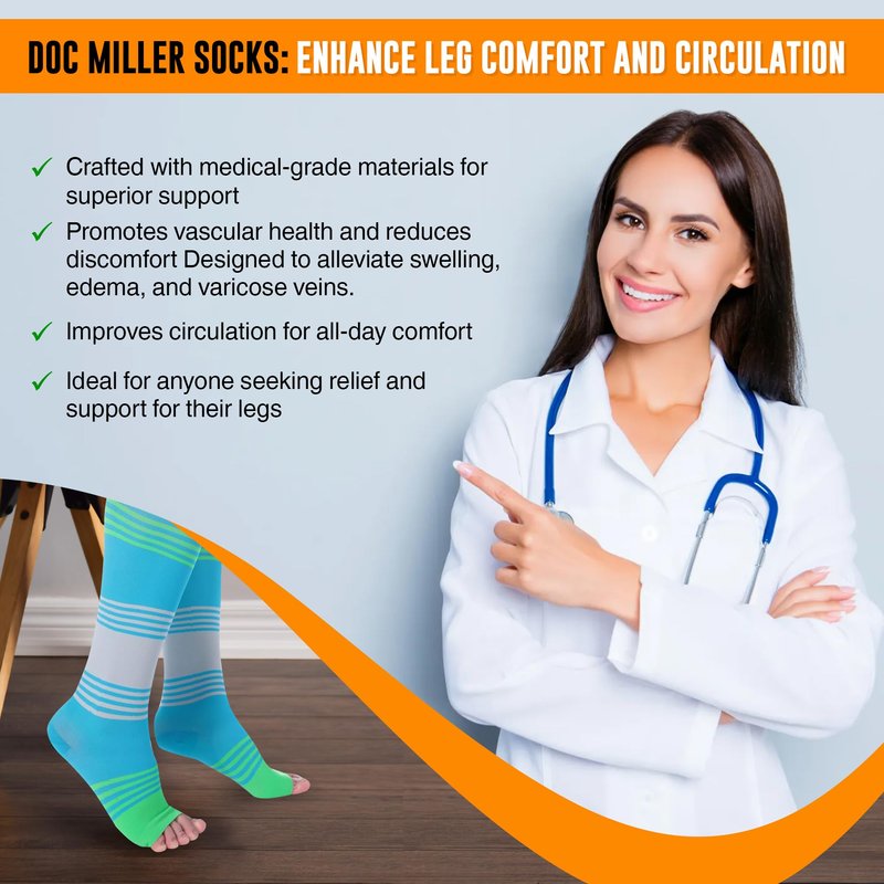 Doc Miller Open Toe Compression Socks are meticulously crafted for both men and women seeking effective relief from calf, shin splint, spider, and varicose vein discomfort. Made with premium-quality washable Nylon, these toeless compression socks offer medical-grade support, aiding muscle recovery and providing effective pain relief for conditions like plantar fasciitis and edema. Suitable for diverse individuals including pregnant women, athletes, and those who stand for prolonged periods—such as nurses—these socks are engineered for optimal comfort and support. The incorporation of an attractive striped design enhances both functionality and aesthetic appeal, making them perfect for daily wear or special occasions. The striped design not only adds style but also serves as a visual aid for assessing proper alignment and fit, ensuring optimal compression therapy. Moreover, the vibrant colors of the stripes add flair while promoting awareness of foot alignment, particularly beneficial for individuals recovering from foot-related injuries or surgeries. Choose from a wide range of colors and compression strengths to suit individual needs and preferences. Whether you're seeking full-length compression socks, thigh-high stockings, or toeless compression sleeves, Doc Miller has you covered. Our compression solutions are available in various sizes, catering to diverse body types and preferences. Experience the ultimate in compression therapy with Doc Miller Open Toe Compression Socks. Trust in our commitment to providing premium-quality products that prioritize your comfort, performance, and overall well-being.