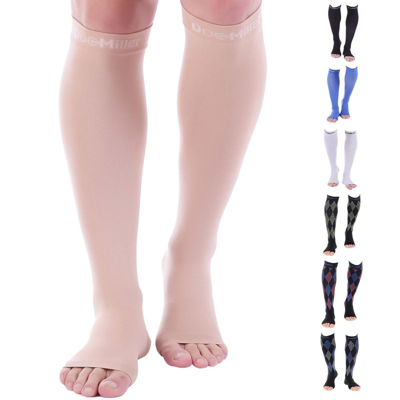 "Experience unparalleled comfort and therapeutic benefits with Doc Miller Toeless Compression Stockings for Women and Men. Crafted with washable Nylon material, our medical-grade compression socks provide superior support and relief for a range of conditions, including calf and shin splints, spider and varicose veins, plantar fasciitis, and edema. Whether you're a dedicated athlete seeking enhanced muscle recovery or a hardworking professional in need of all-day comfort, our open-toe compression socks are your ultimate solution. Designed to promote circulation and alleviate discomfort, these compression stockings are ideal for pregnant women seeking relief from swelling and discomfort. With a precise and snug fit, they allow for unrestricted movement throughout the day. Perfect for use with sportswear for added protection and strength, these socks are also a go-to choice for individuals with jobs that require long hours on their feet. Choose from a variety of colors and compression strengths to match your style and preferences. Whether you prefer subtle neutrals or vibrant hues, our selection has something for everyone. With compression strengths ranging from 30-40mmHg, you can select the perfect level of support to meet your needs. At Doc Miller, we're dedicated to providing products that deliver exceptional results and unparalleled comfort. Our comprehensive collection includes not only open-toe compression socks but also full-length compression socks, thigh-high stockings, toeless compression sleeves, elbow braces, ankle sleeves, and calf sleeves. Available in various sizes, colors, and patterns, our products cater to diverse needs and preferences. Experience the difference with Doc Miller's open-toe 30-40mmHg compression stockings and discover the ultimate relief and support you deserve. Invest in your well-being today and elevate your comfort and performance with our compression solutions.