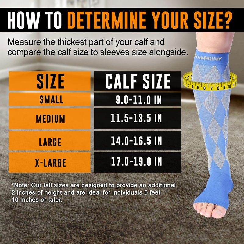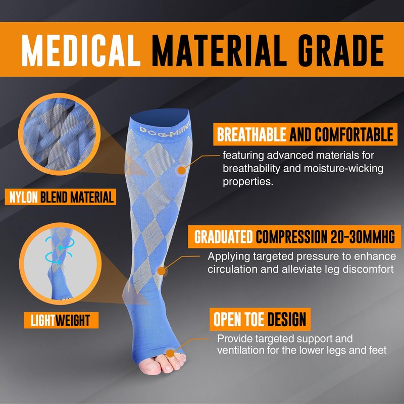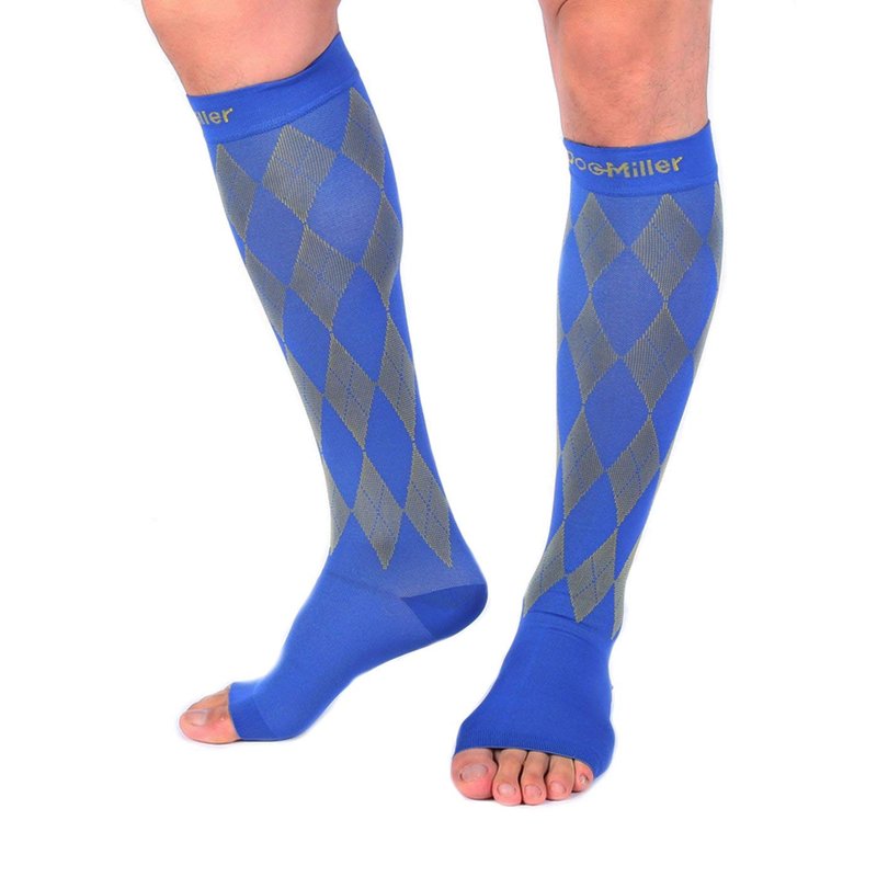 Doc Miller Open Toe Compression Socks, meticulously designed for both men and women seeking effective relief from calf, shin splint, spider, and varicose vein discomfort. Crafted with premium-quality washable Nylon, these toeless compression socks offer medical-grade support, aiding in muscle recovery and providing effective pain relief for conditions like plantar fasciitis and edema. Suitable for a diverse range of individuals, including those looking for support during pregnancy, athletes, and individuals who stand for prolonged periods—such as nurses—these socks are meticulously engineered to deliver optimal comfort and support. The incorporation of an attractive Argyle pattern enhances both functionality and aesthetic appeal. The Argyle pattern serves as a visual aid for assessing proper alignment and fit, ensuring optimal compression therapy. Moreover, the Argyle pattern's intricate design serves as a gentle reminder of the importance of proper circulation and foot health. It promotes awareness of foot alignment, making it particularly beneficial for individuals recovering from foot-related injuries or surgeries. Additionally, the pattern's vibrant colors add a touch of style, making these socks suitable for daily wear or special occasions. Choose from a wide range of colors and compression strengths to suit your individual needs and preferences. Whether you're looking for full-length compression socks, thigh-high stockings, or toeless compression sleeves, Doc Miller has you covered. Our compression solutions are available in various sizes, catering to diverse body types and preferences. Experience the ultimate in compression therapy with Doc Miller Open Toe Compression Socks. Trust in our commitment to providing premium-quality products that prioritize your comfort, performance, and overall well-being.