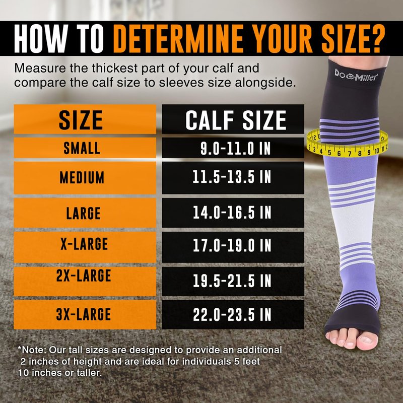 Doc Miller Toeless Compression Socks for Women and Men are designed for recovery from calf, shin splint, spider and varicose veins. These open toe compression socks for men and women may provide pain relief for sore muscles, plantar fasciitis and edema. We are using premium quality washable Nylon material to give you medical grade compression socks for women and men, a perfect use in pregnancy, with sportswear for protection and strength and for those who have to stand long on the job. These open toe socks have sleek design, which makes them wearable for daily use or for any special occasion. Select from a wide range of colors and compression strengths. At Doc Miller we always strive to provide you with great products that bring the required compression, pain relief, required results and comfort you are looking for. We have a wide variety of compression socks - you can get full length compression socks, thigh high stocking, toeless compression sleeves, elbow braces, ankle sleeves, and calf sleeves in different colors, size, plus size, compression and patterns. Get the open toe 20-30mmHg compression socks for the ultimate relief.