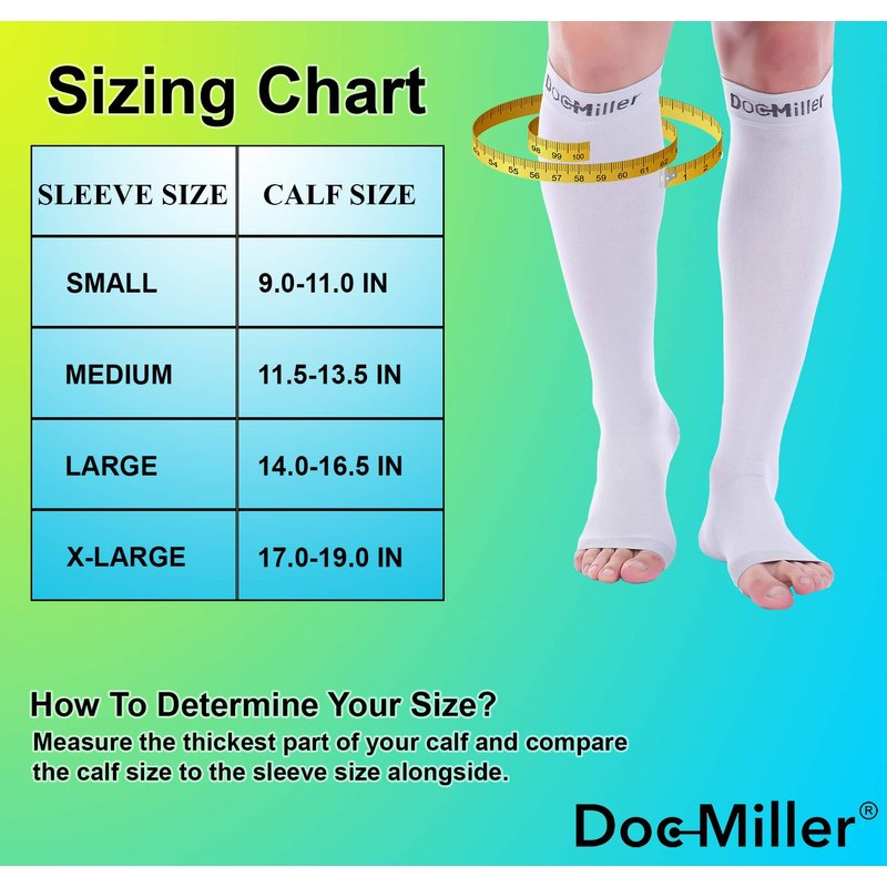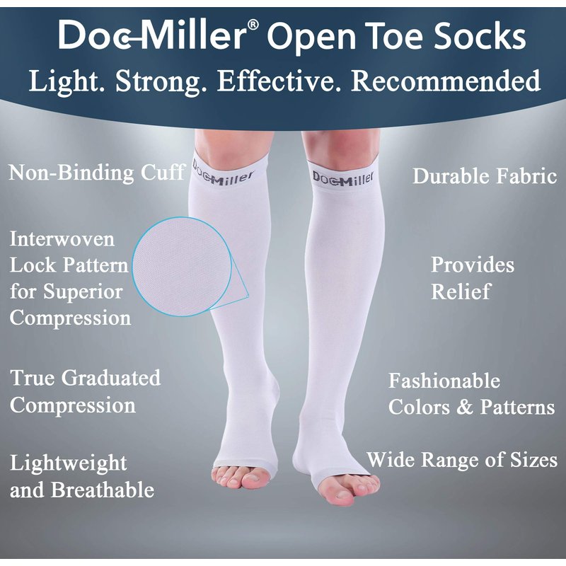 These toeless compression socks for women and men are 30-40mmHg the strongest compression stockings. Our men's sports compression socks provide you the right compression and quicker recovery from calf injuries, varicose veins and sore muscles. Our open toe socks are perfect for pain relief from sore muscles, plantar fasciitis and edema. With the graduated compression, these foot socks are the right choice for pregnant women, nurses, football, golfers, gymnastics, doctors and any other activity that requires active use of legs. We at Doc Miller value your money and always strive to provide you with great products that bring the required compression, pain relief, results, and comfort you are looking for. We have a wide variety of compression socks, you can get knee-high compression socks, thigh high stockings, toeless compression sleeves, elbow braces, ankle sleeves, and calf sleeves in different colors, sizes, plus sizes, compression and patterns.