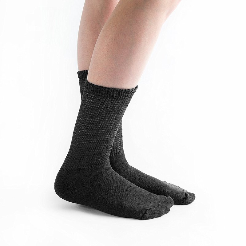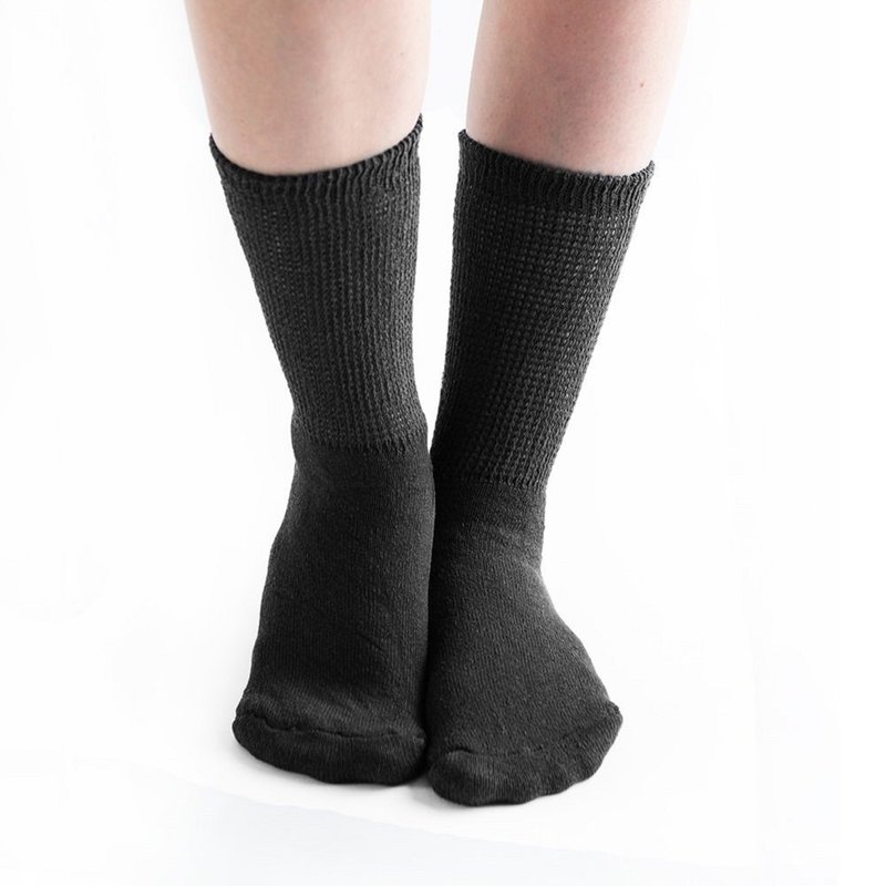 The Doc Ortho Loose Fit Crew Length Diabetic Socks are designed to be non-binding and loose fitting to prevent constricting of the legs and feet. Special attention is made to ensure they do not restrict circulation. The Doc Ortho Diabetic Socks help control moisture reducing the risk of infection. Doc Ortho Diabetic Socks are sure to be the best diabetic socks you've ever owned. Available in black, white, navy, brown, gray or tan and in four different sizes. Fits Shoe Size: Small (Women's 4-7), Medium (Women's 7.5-10 / Men's 6-8), Large (Women's 10.5-13.5 / Men's 8-11), X-Large (Men's 11-13). LIFETIME GUARANTEE!