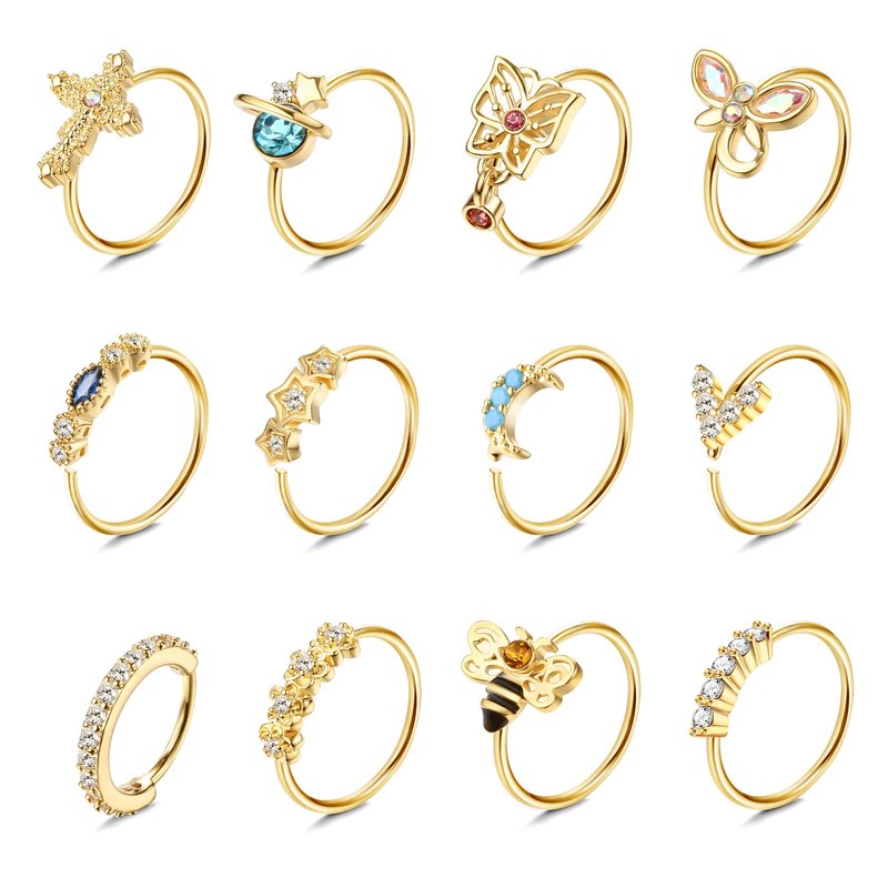 - 12PCS Nose Rings Set: Package include 12Pcs of different nose rings: flower/butterfly/star/moon/bee/CZ Etc. Classic and stylish designs, bring you different charming every day.