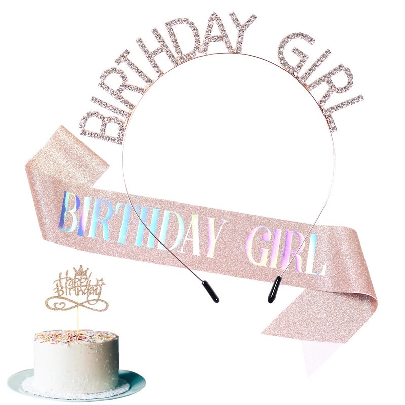 Docooniver Rose Gold Birthday Headband for Women,Birthday Girl Sash and Crown for Girls and Women,Birthday Gift for Her,Happy Birthday Cake Topper,Accessories for Birthday Decorations.