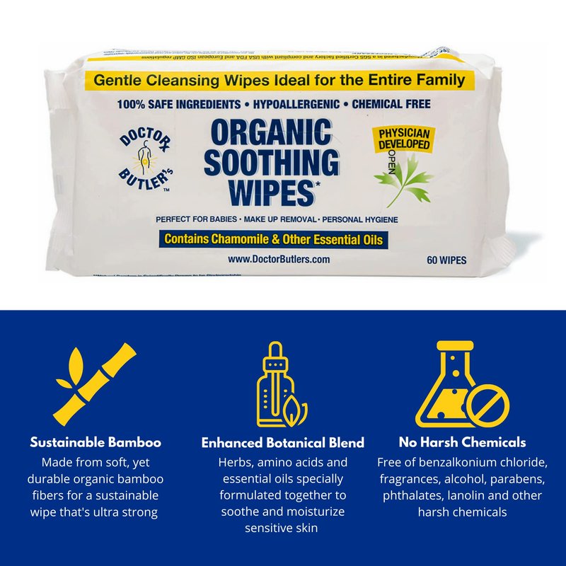 Soothing Wipes Made from Organic Bamboo Fibers Doctor Butler’s Soothing Wipes are physician formulated and sourced from sustainable and durable bamboo for a soft, thick, and tear-free wet wipe for women, men, and children. Ideal for all types of body cleaning and hygiene, they’re convenient to store at home or for on-the-go travel wipes! Plant-Based and Great for Sensitive Skin Our sanitary wipes are infused with botanical, plant-based ingredients including chamomile and calendula oils, vitamin E, and rosemary oil for soothing hydration. The formula is witch hazel free for extra sensitive skin, and free of chemical irritants such as alcohol, petrochemicals, phthalates, formaldehyde carriers, parabens, phenols, quaternary ammonium compounds, SLS or lanolin. Choose a more natural wipe that feels clean but never chemically. Doctor Butler’s wipes are certified cruelty-free by Leaping Bunny, are EWG-certified, and the bamboo fibers used to produce these wipes are Global Organic Textile Standard (GOTS) verified organic. Our pride and commitment to quality is demonstrated by our manufacturer’s best-in-class safety records and working environment, efficient practices, and sustainability. Multi-Purpose and Safe for the Whole Family Designed for all kinds of uses to suit your personal needs, these versatile water wipes can be used as facial wipes, makeup wipes, hemorrhoid wipes, baby wipes, and for body and hand cleaning. Make the most of each thick wipe, perfect for travel, camping, car, and office.