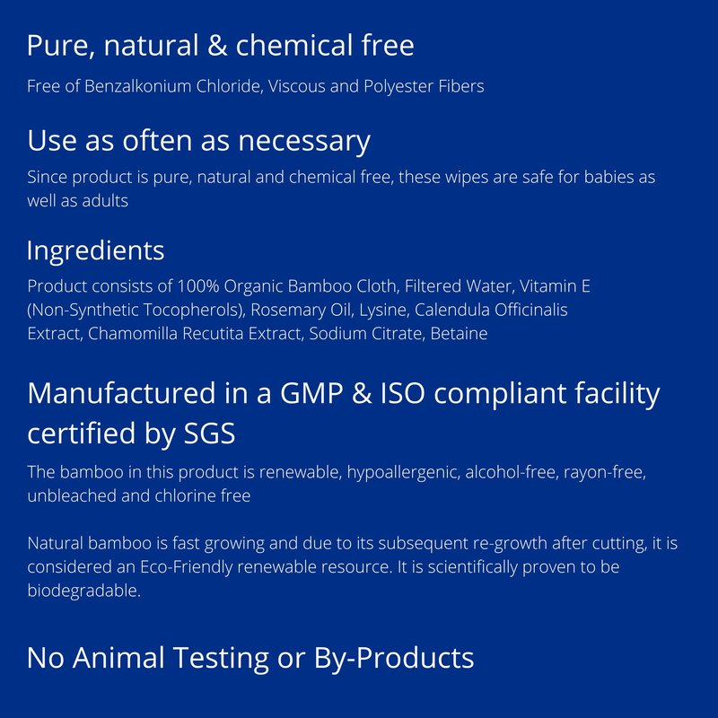 - ORGANICALLY SOURCED BAMBOO WIPES: Made from sustainable organic bamboo fibers, these full body wipes are thick and durable, yet soft and comfortable. They’re made with calming essential oils like chamomile extract and calendula, which help with dry irritated skin