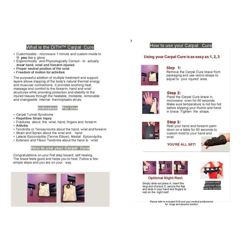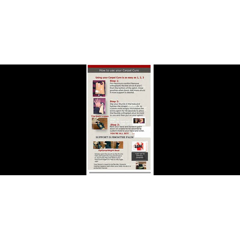 The Ultimate Brace and Splint for Hand & Wrist Injury -Custom Molds to your Hand in One Minute….. The Night Resting Piece Allows Healing of Arthritic Fingers and Improved Healing for Carpal Tunnel……..Treat Carpal Tunnel Without Surgery, Arthritis of the Fingers, Tennis Elbow (Lateral Epicondylitis),Fractures and Tendinitis! The Carpal Cure features Proper Wrist Neutral Position for Healing and its semi flexible Patented Orthoplastic Struts mold to you for support with optimal comfort in just 60 seconds! A New Type Splint that flexes, bends, moves AND still protects you while you heal! Developed by a Hand Surgeon to help patients heal with and without surgery.