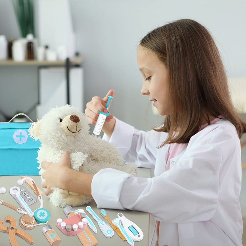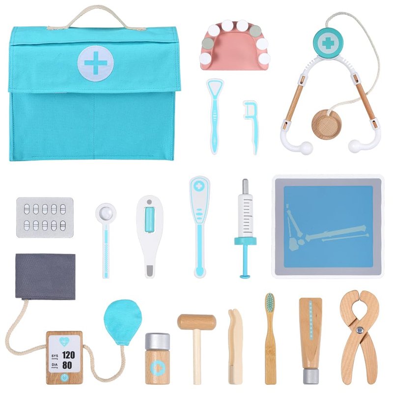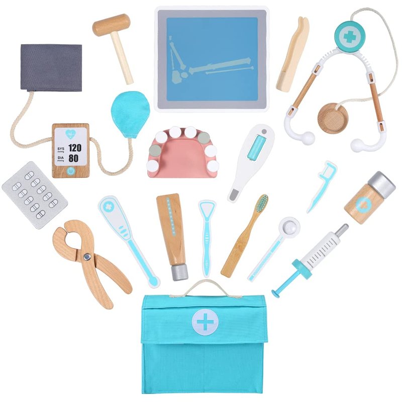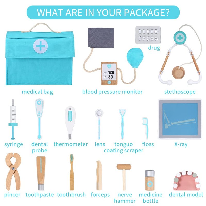 - 【18 Pieces Doctor Toys】Our wooden dentist game set includes stethoscope medical case, ointment, medicine box, pill, dental model, pliers, hammer, toothbrush, syringe, blood pressure monitor, handbag, dental floss and other rich accessories.
