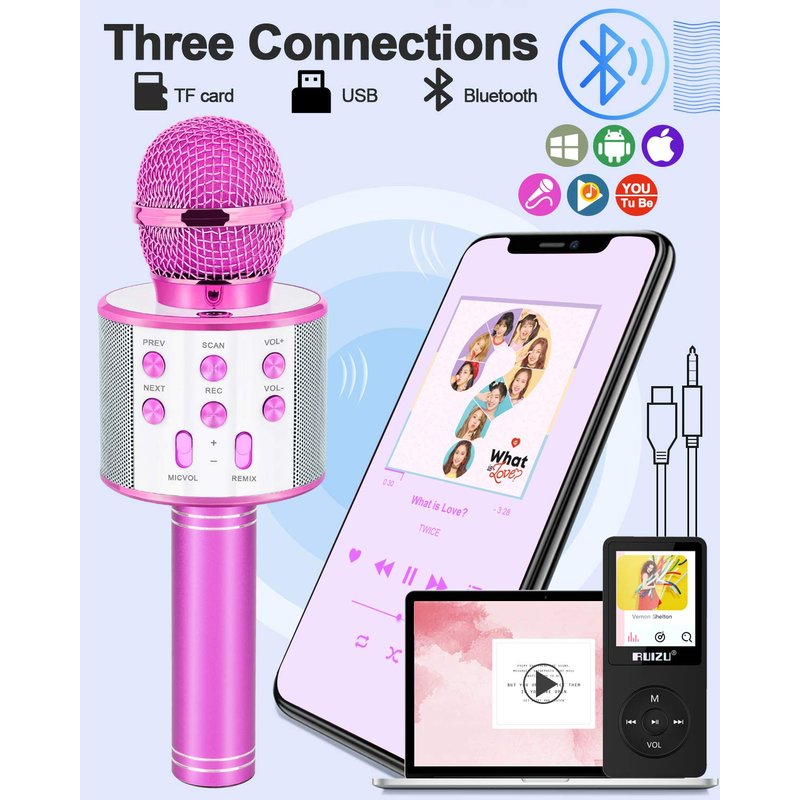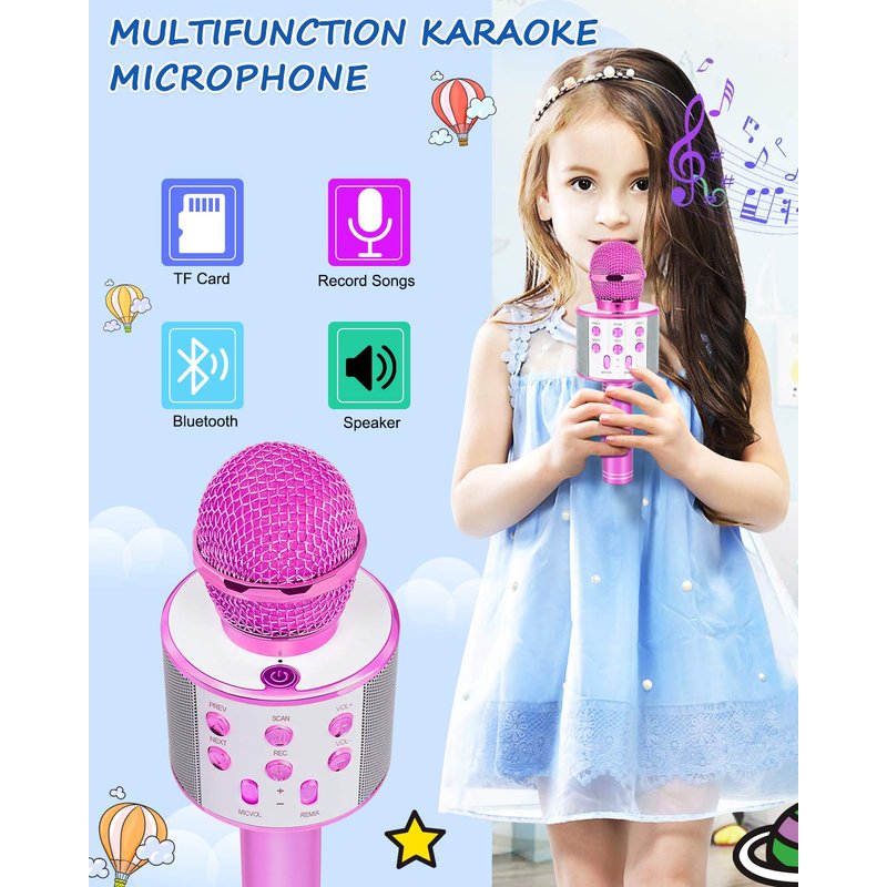 - 𝄞 Magic Sound: The karaoke microphone is interesting toys for kids bringing so much fun! Our karaoke microphone has 4 magical sounds including child voices, tough voices, male voices and honey voices. Let kids enjoy magical singing and glue to this present.
