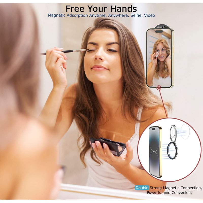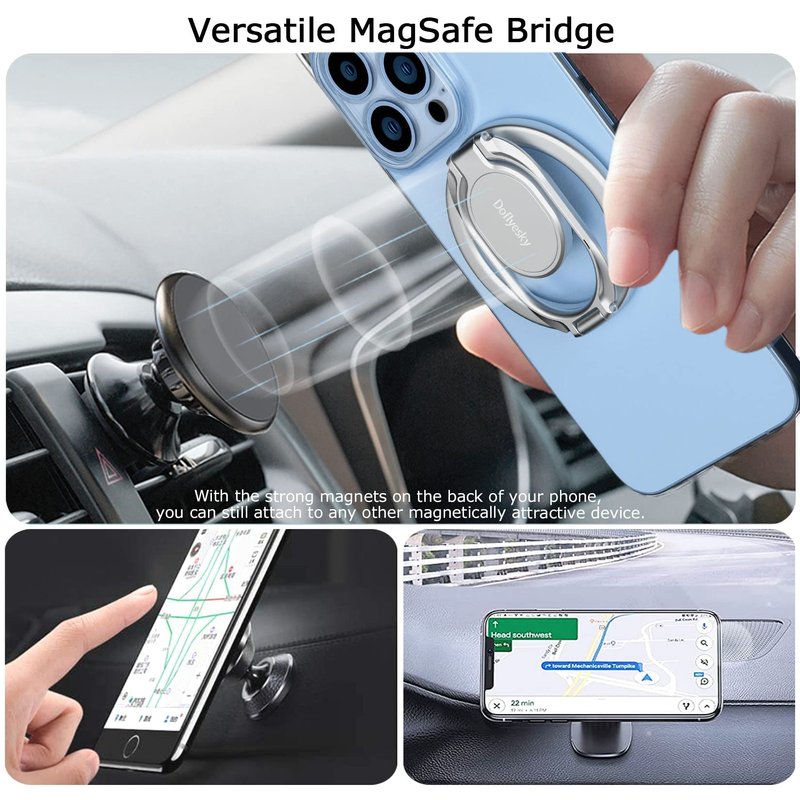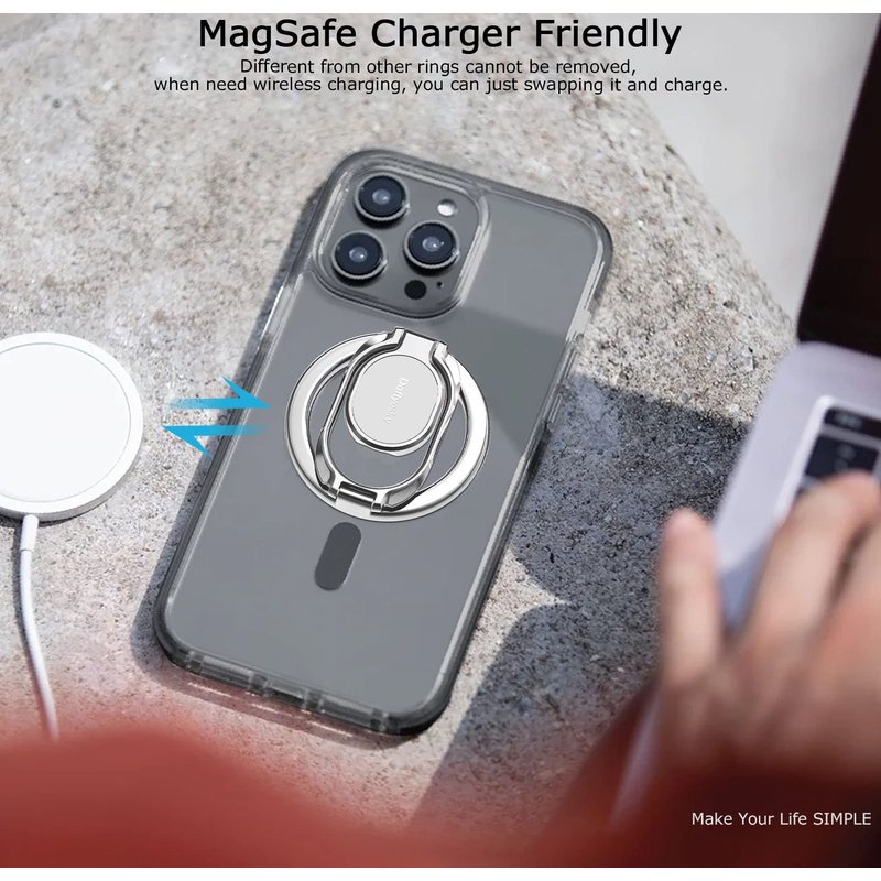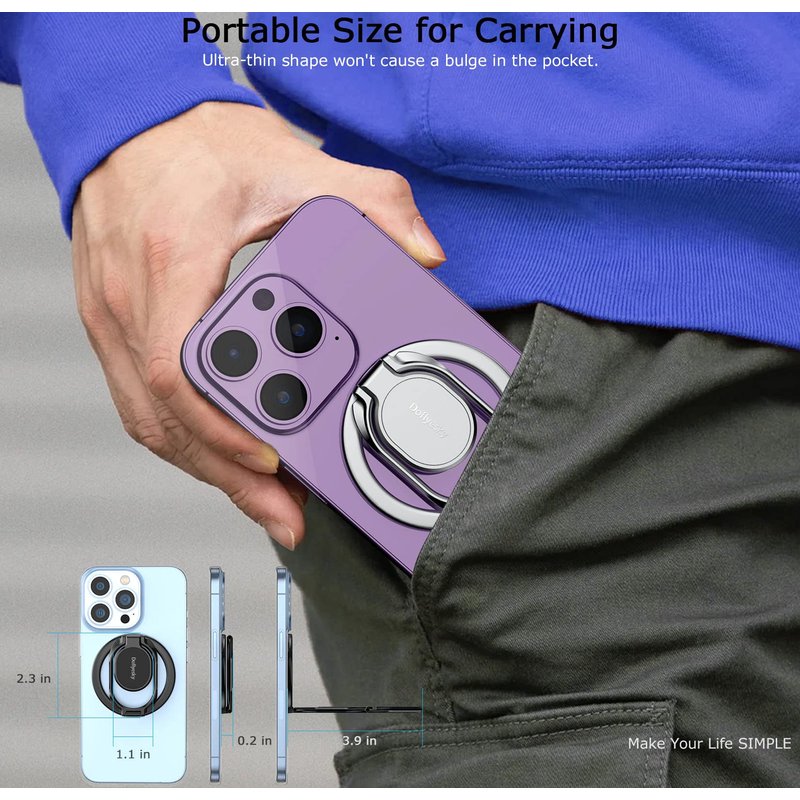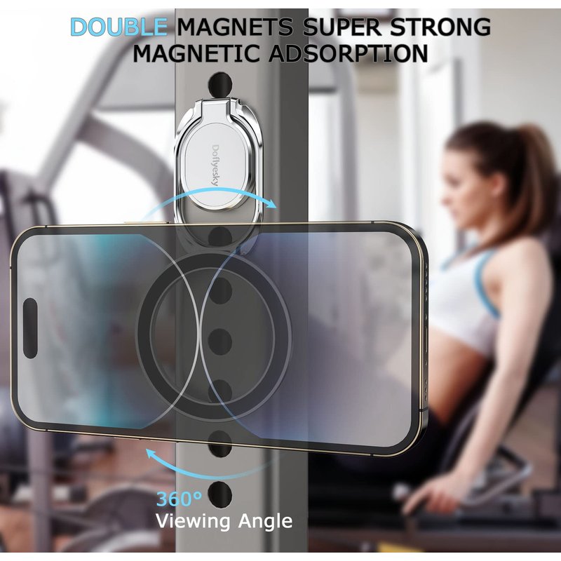 Magnetic Phone Ring Holder with Magsafe, Double Adjustable Gym Finger Ring Grip and Stand, Removable Phone Grip, for iPhone, iPad and Smartphones, Compatible with Magnetic Car Mount Upgrade MagSafe Phone Grip Holder Kickstand (iPhone & Android Friendly) Lifetime Service & One-off Free Replacement. Designed for All Phones 【Wide Compatibility - Both iPhone & Android Users Friendly】This phone grip holder can snap directly to the magnetic case for iPhone XS Max,XS,XR,X, 8+, 8,7+,7,6S+,6S, 6+,11, 12/12Pro/13/13Pro/13ProMax/15/15 Pro/15ProMax/14/14Pro/14ProMax, Plus, Mini, XR, SE or (magnetic cases) for your Samsung Galaxy S23/22/21/20 Ultra, Plus, S23/22/21/20,S10 plus/S10; Note 20 Plus/20/10 plus/10/9/8; A71/A51/A50/A10, Google Pixel 7/6/5/4a,Pro,5/4/4XL or other android phone. If using Non-Magnetic Regular iphone cases, you have to use metal ring included first (stick to your case), then enjoy the magsafe stand/ grip holder. 【360° Rotatable Stand, Right Angels】Stylish yet functional! This magnetic ring stand is 360°&280° rotatable and can be positioned at the best viewing angle for your phone; It's perfect to use as a phone stand when watching videos, taking selfies, texting, or just keeping your phone on the desk. The collapsible design also allows it to easily fit in your pocket when not in use. 【Built-in Magnetic Snap - Easy Attach and Detach】Strong built-in magnets securely attach the cell phone holder grip to MagSafe-compatible cases, while snapping your friends (magsafe-compatible car mount, metal surfaces, like refridgrators). Easily Detach for Magsafe Wireless Charging. Coated with silicone to keep device and your magnetic case scratch-free.