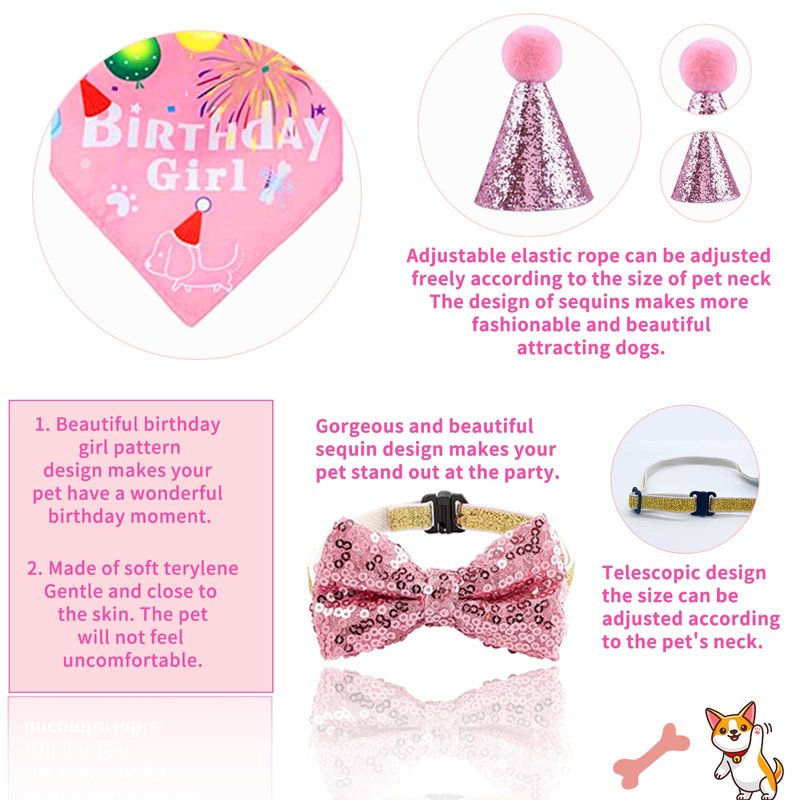 - Premium Material: Dog birthday party supplies bandana, bow tie and dog party hat are made of soft and lightweight fabric, soft and comfortable to wear. The band is elastic, can stretch to 20''. This dog birthday girl set is suitable for most breed of dog and bring some surprises to your furry pets. Please measure your dog's neck girth, and leave room to tie out.
