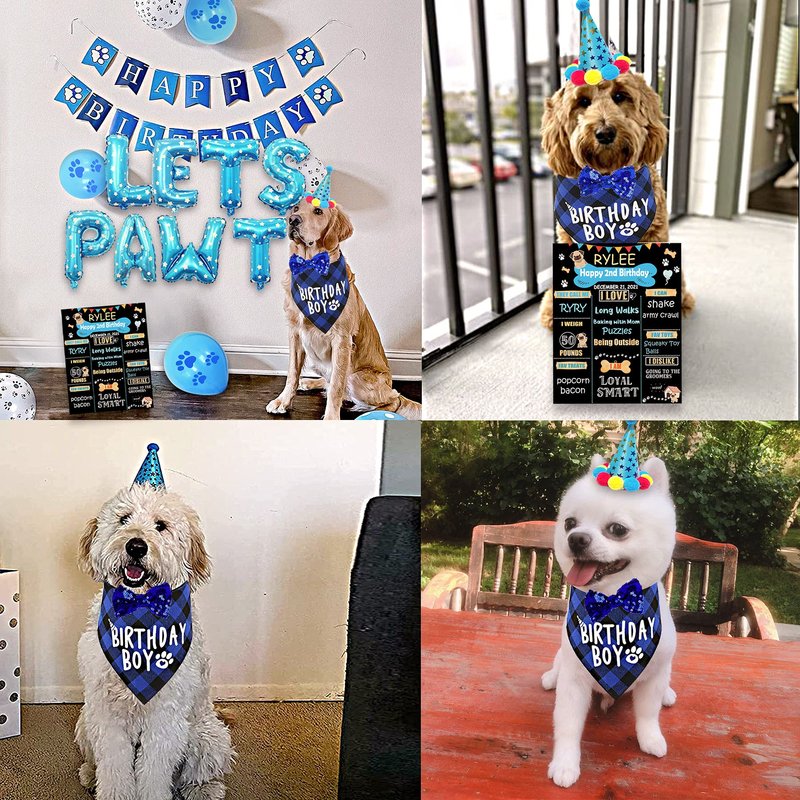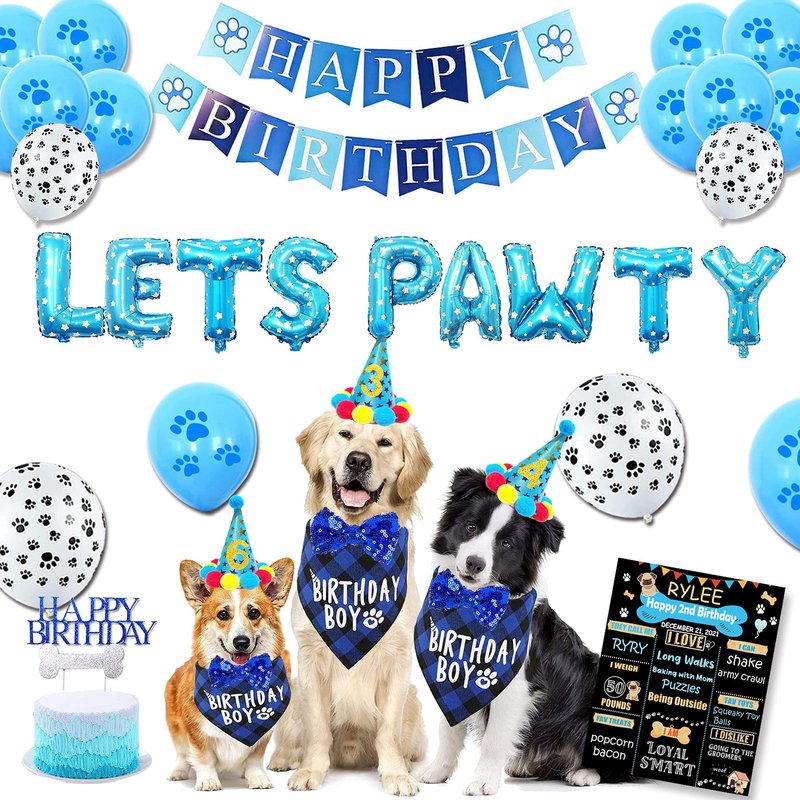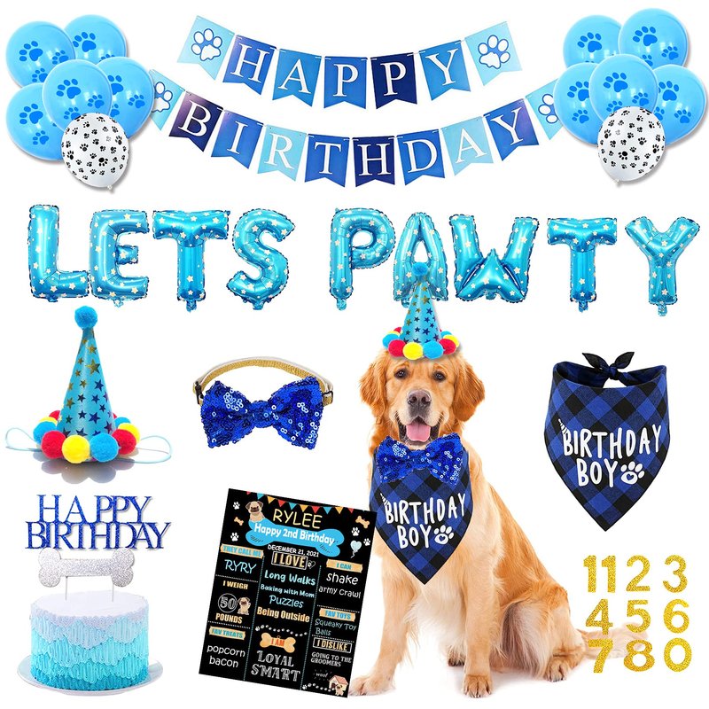 - Dog Birthday Party Supplies Boy Includes - 1× birthday boy scarf, 1×bow tie collar, 1×hat with 10pcs shiny birthday numbers, 1×dog happy birthday banner, 1×dog happy birthday cake topper, 1×lets pawty banner balloon, 1×dog birthday poster, 12× dog birthday latex balloons.