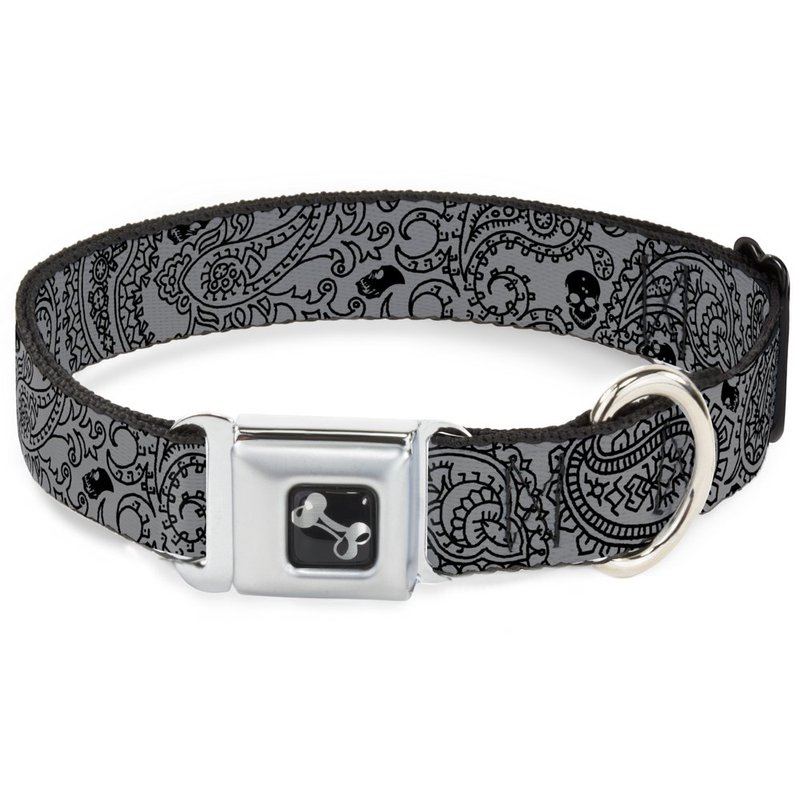 - Style: Buckle-Down Seatbelt Buckle Dog Collar - Bandana/Skulls Silver/Black - 1" Wide - Fits 15-26" Neck - Large
