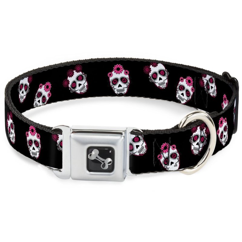 - Style: Buckle-Down Seatbelt Buckle Dog Collar - Staggered Sugar Skulls Black/Pink/White - 1.5" Wide - Fits 18-32" Neck - Large