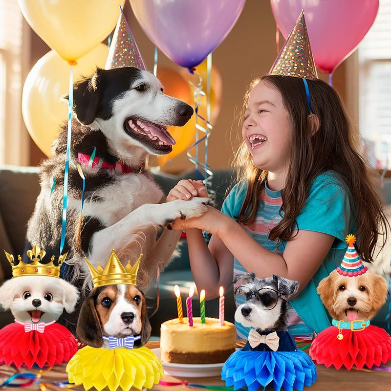 - Puppy Birthday Decorations Pack: Our dog themed birthday party decorations set include 1 dog birthday banner, 4 dog birthday party honeycomb centerpieces and 6 dog hanging swirls, they can be your puppy party decorations and dog birthday decorations more colorful.