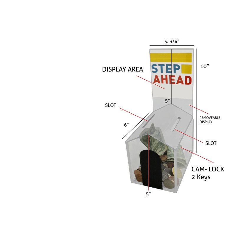 This House donation box is perfect for house-themed charity drives! Each house shaped box is made from durable acrylic, and features a locking door with key, as well as pre-drilled holes on the bottom of the box (for mounting on a table or counter surface),This secure donation box also has two coin or money slots at the top, one on each side of the house. Each insert slot measures 2” wide and 0.4” long. To attract visibility and promote your cause, each donation box also comes with a sign holder, which fits a 5.5”W x 8.5”H printed sign. Overall dimensions: 5.8”W x 14.3”H x 8.8”D. Weight: 1 lbs.