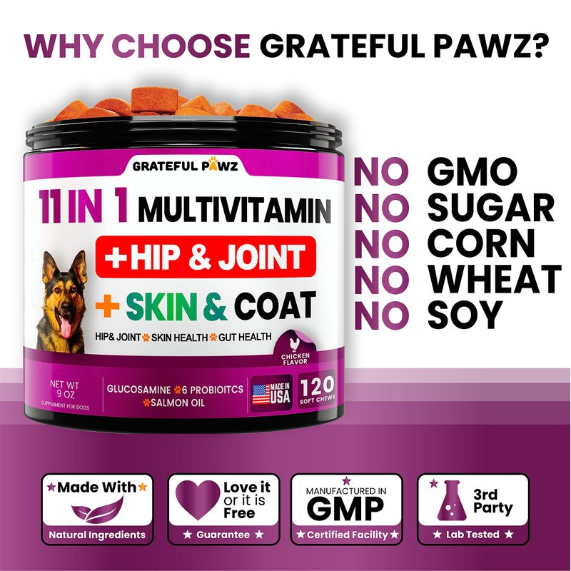- Hip and Joint Support: The Grateful Pawz natural dog vitamins multivitamin can help reduce joint inflammation and rigidity, allowing your dog to enjoy enhanced mobility and flexibility by increasing lubrication.