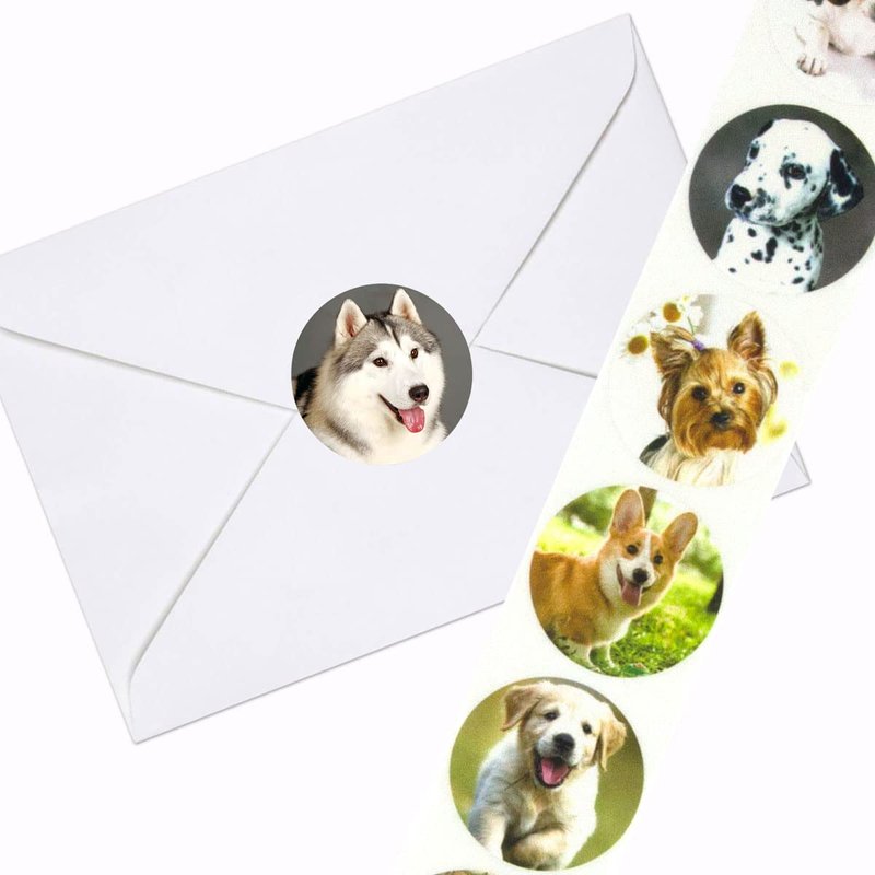 - What You Get - 9 cute dog design. Shrink-wrapped. 1 1/2". Paper. 200 stickers per roll.