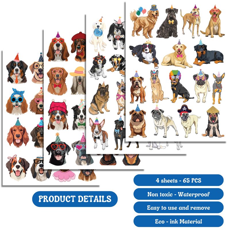- DOG BIRTHDAY PARTY DECORATIONS: 4 sheets dog birthday temporary tattoos stickers with 65 different patterns bring many interesting times, meet your decoration needs.