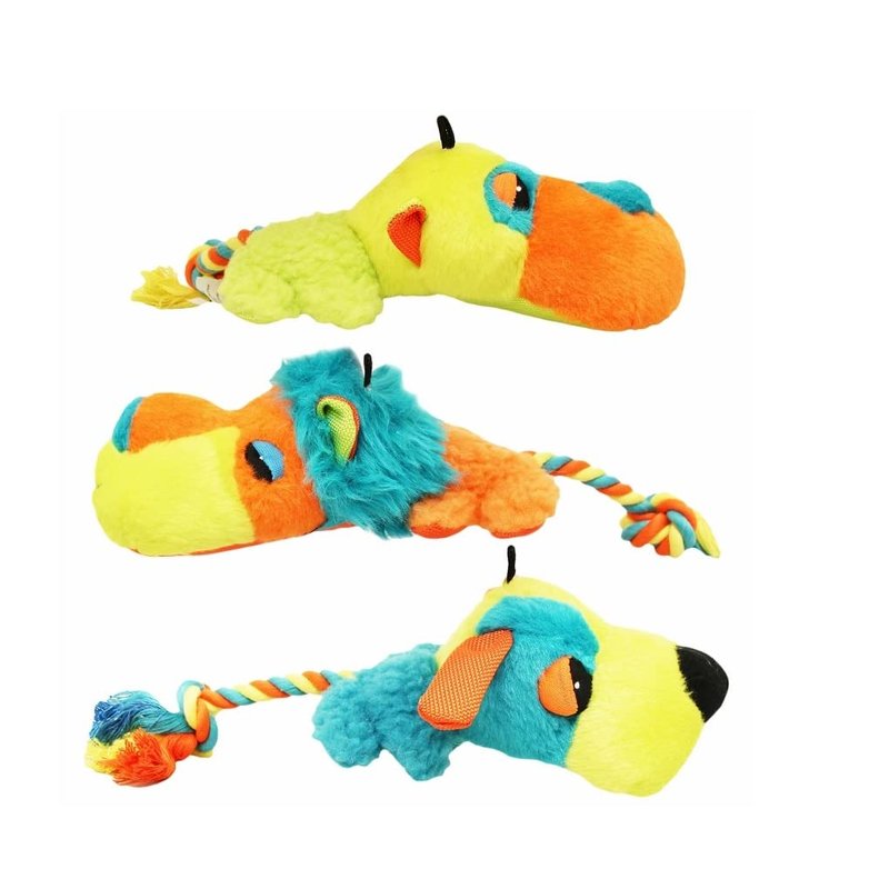 Plush FatHeadz Dog Toy With Rope Tail Adorable plush fatheadz are perfect for dogs who love to carry their toys. Rope tail makes for fun games of tug and fetch, and dogs will love to cuddle these too! Perfect for all dog sizes! Contains a squeaker for interactive playtime! Choose from dog, monkey, lion, or all three animals! Size: 15" Materials: Super soft plush; Cotton Rope, Polyfil, Squeaker
