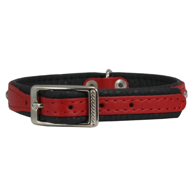 Gorgeous high quality dog collar. Pliable and strong, trimmed with thick waxed thread. Top surface made of high quality 100% genuine leather. Soft and comfortable black leather oversized padding. Crystal clear, sparkling rhinestone crystals are individually set. 1/2" wide. Features nickel-plated buckle and riveted center D-ring. 5 holes for adjustment. Available in 4 sizes and 6 color options. Designed for X-Small and Small dogs. Please measure dogs neck to ensure you order the correct size.