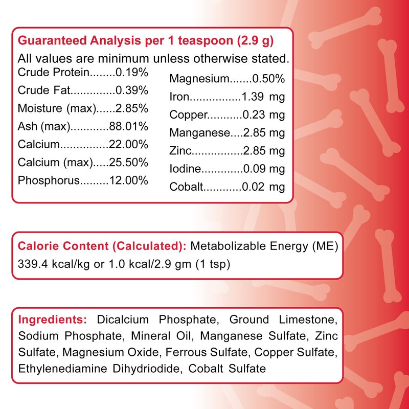 The unknown sources of bone meal have been a concern to people because there is no way to determine the actual content of most bone meal products for animals. We developed this product to be a substitute for bone meal and provide the calcium, phosphorus and minerals needed. You know exactly what you are giving your dog and it is clean with no rancidity problems.