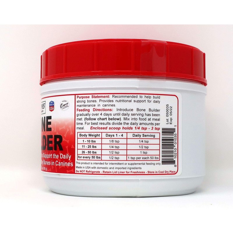 Dogzymes Bone Builder is a low volume, cost effective calcium supplement which contains no rendered products and is made from all human-grade ingredients. It contains Calcium, Magnesium, Phosphorus, Cobalt, Copper, Iron, Manganese, Zinc and Iodine. This is a great product to use for dogs to replace actual bone meal in diets.