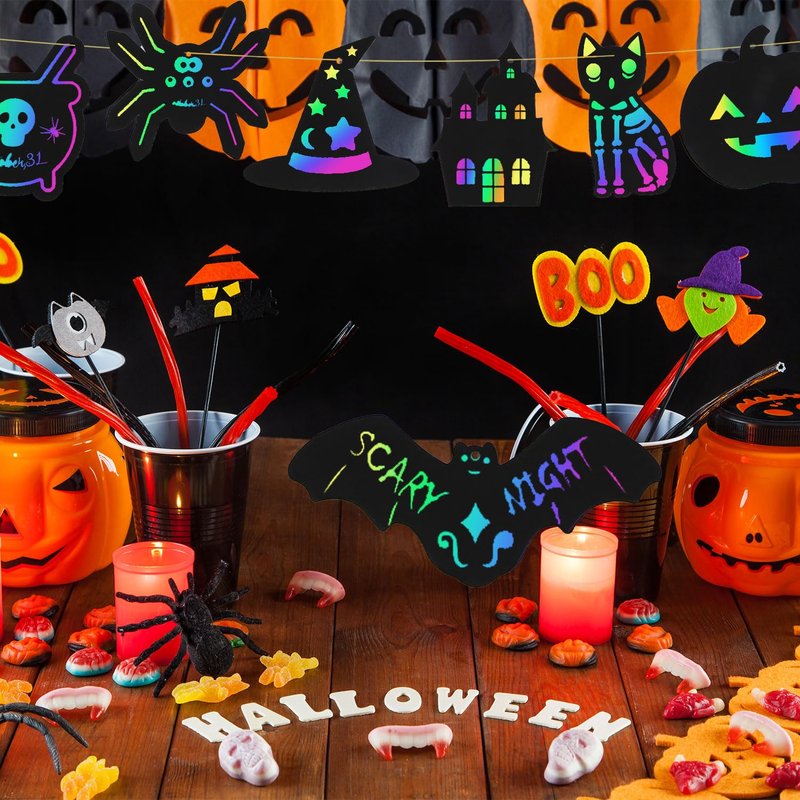 - Applications: You can invite your friends and family together DIY scratch papers, hanging them with cords as your Halloween decoration. Great DIY craft project for parent-child interaction, you also can give them to your friend and your family as gifts.