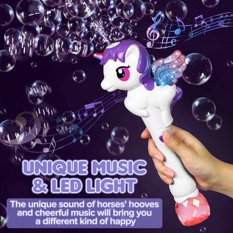 - Lights & Music Adventure: Embark on a magical journey with flashing lights & enchanting hoofbeat music. Our unicorn wand transforms bubble play into an immersive world of light, sound, & bubbles