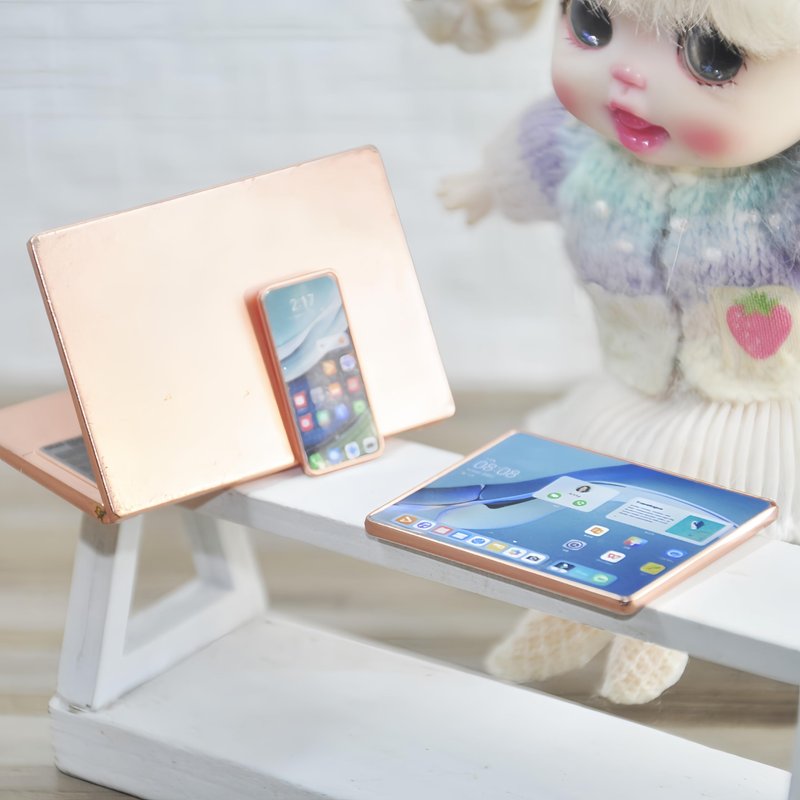 Dollhouse Decoration Miniature Accessories Dollhouse Worlds Smallest Computer Laptop Tablet Phone Simulation Accessories for Doll 1:6 1:12 Miniatures Play Set (Rose Golden)