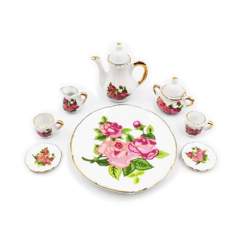 Dollhouse Tea Cup Sets 1:6 Scale Miniature Porcelain Dollhouse Accessories 8PCS Flower Pattern Teapot Platter Dish Sets Dollhouse Kitchen Supplies Decoration (Rose)