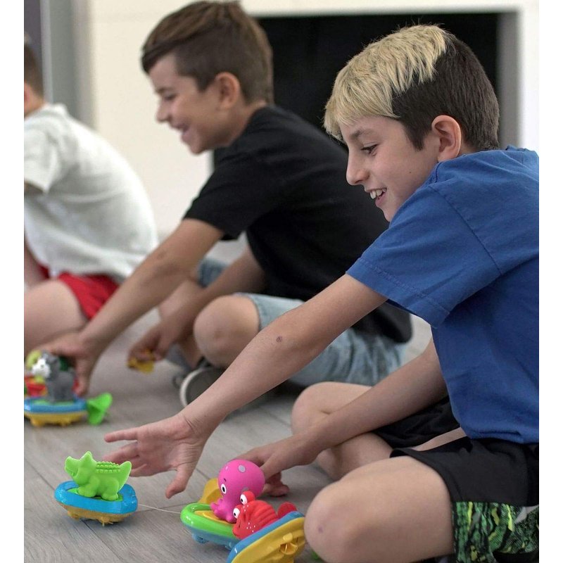 Ready! Set! GO! The Dollibu Alligator Boat Racer Buddy will be a big hit as it joins your little one for splashing fun in and out of the bath tub or pool. Motorized racing toy will run on any surface with its easy pull-and-go function–no batteries needed. Pull the propeller string back to wind up the wheels, set the fast racer down, and watch ‘em go from floor to water for a photo finish. Great for toddlers and kids who love to race! Boat features 3 colors blue, green, and yellow with a green Alligator rider. Makes the perfect gift for Alligator lovers and young jungle explorers! Whether your toddler plays alone, race with friends and siblings, or imaginative play with parents, the toy’s 3-in-1 ways to play makes them the first rated choice for playdates, playtime, bath time, and adventures. Need a pit-stop? Let kids imagine the tub as the jungle, take the Alligator off its boat, and enjoy finger puppet play! The fun detachable green Alligator and wind up boat can be played with separately for fun and games: swimming, running, crawling, and play. Watch it float! Boat Racer Buddies encourage developmental and educational skills for toddlers like color recognition, jungle animal names, and motor skills. From baby bubble bath fun to kids playing with friends, multi-use boat racer will grow with your child. Collect 'em all for your toddler to mix-and-match. Buddies make the perfect party favors at zoo, safari, and carnival themed birthdays! More characters available: bear, crab, duck, elephant, frog, lion, pig, shark, and wolf. Size: Boat 6"x3"x1.75", Alligator 3"x2.25"x1.75".