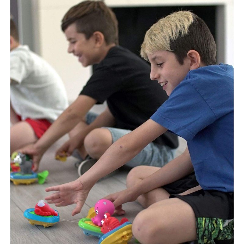 - PULL AND GO, NO BATTERIES REQUIRED: Includes 1 Boat Racer Buddy featuring a fun detachable red Lobster finger puppet toy and an easy-to-use wind up motorized speedboat. Boat’s soft rounded edges are perfectly designed for little hands to grasp. Pull-and-go function – NO BATTERIES NEEDED! The floating lobster and boat can be played with separately for multi-use fun and games: swim, run, crawl, play! Collect 'em all for your kid to mix-and-match. Size: Boat 6"x3"x1.75", Lobster 3"x2"x2.25".