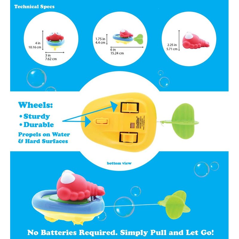- 3 STIMULATING PLAYABLE MODES: Make bathtub time a fun splash with the Dollibu Lobster Boat Racer Buddy. Simply pull the propeller string to wind up wheels, set it down, and watch it speed on land or water. Race against friends in the pool and the living room floor. Need a pit-stop? Let kids imagine the bath tub as the ocean, take the red lobster off its boat, and enjoy finger puppet play! Boat racers are fast water toys sure to keep kids busy for hours while providing more than one way to play.