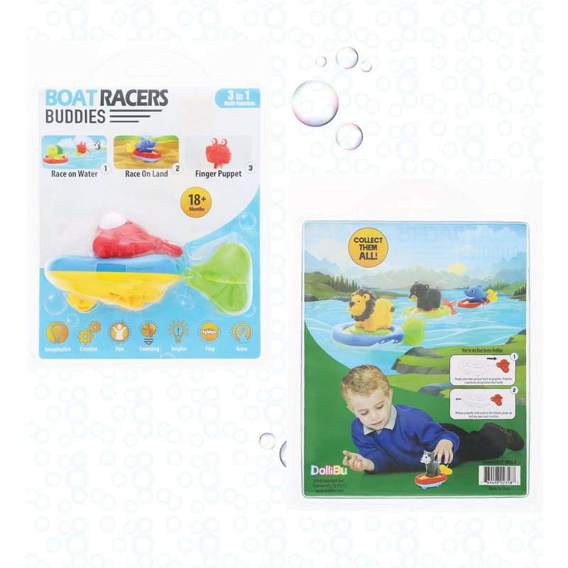 Ready! Set! GO! The Dollibu Lobster Boat Racer Buddy will be a big hit as it joins your little one for splashing fun in and out of the bath tub or pool. Motorized racing toy will run on any surface with its easy pull-and-go function – requiring no batteries. Simply pull the propeller string back to wind up the wheels, set the fast racer down, and watch ‘em go from floor to water for a photo finish. Great for toddlers and kids who love to race! Boat features 3 colors blue, green, and yellow with a red lobster rider. Makes the perfect gift for Lobster lovers and young ocean explorers! Whether your kid plays alone, race with friends and siblings, or imaginative play with parents, the toy’s 3-in-1 ways to play makes them the first rated choice for playdates, playtime, bath time, and adventures. Need a pit-stop? Let kids imagine the tub as the ocean by taking the Lobster off its boat, and enjoy finger puppet play! The detachable red Lobster and wind up boat can be played with separately for fun and games: swimming, running, crawling, and play. Watch it float! It’s no secret Boat Racer Buddies encourage developmental and educational skills for toddlers like color recognition, ocean animal names, and motor skills. Bubble bath fun to kids playing with friends, multi-use boat racer will grow with your child. Collect 'em all for your child to mix-and-match. Buddies make the perfect party favors at zoo, safari, and carnival themed birthday! More characters available: bear, crab, duck, elephant, frog, lion, pig, and shark. Size: Boat 6"x3"x1.75", Lobster 3"x2"x2.25".