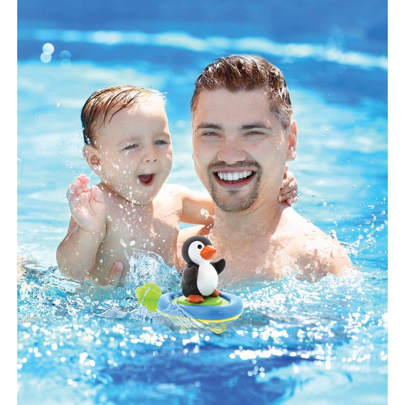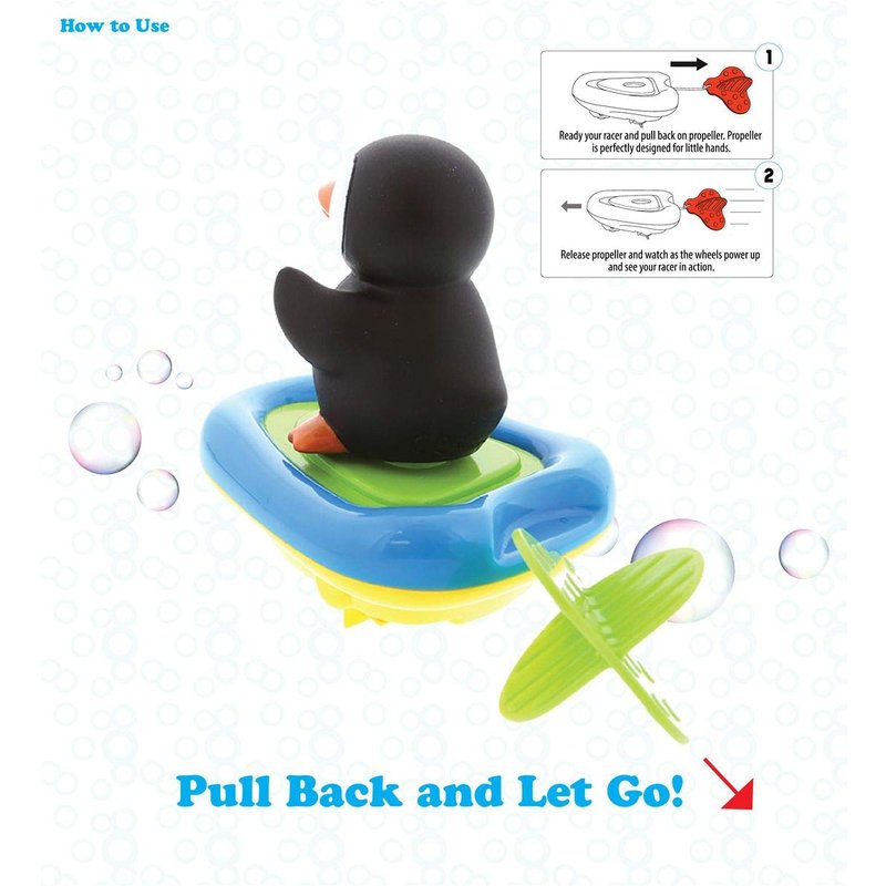 - PULL AND GO, NO BATTERIES REQUIRED: Includes 1 cool Penguin Boat Racer Buddy featuring a fun detachable Penguin finger puppet and an easy-to-use wind up motorized speedboat. Boat’s soft rounded edges are perfectly designed for little hands to grasp. Easy pull-and-go function – NO BATTERIES NEEDED! The floating Penguin and boat can be played with separately for fun and games: swim, run, crawl, play! Collect 'em all for your toddler to mix-and-match. Size: Boat 6"x3"x1.75", Penguin 2.75"x2"x2.75".