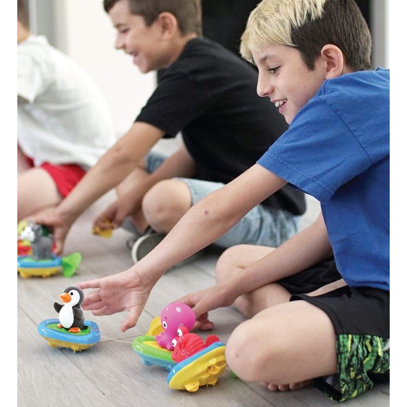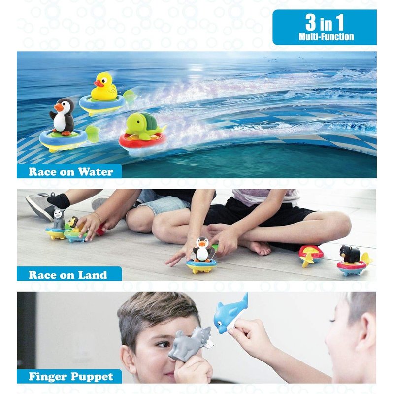 - FOR BATH TIME, POOL FUN AND FLOOR RACING: The perfect gift for toddlers and kids who love to race! Whether they play alone, race with friends and siblings, or imaginative play. 3 in 1 windup racing toy is ideal for play dates, playtime, bath time, and fun games. Parents can use the emperor penguin finger puppet as a fun educational toy to encourage developmental and educational skills for toddlers like color recognition, sea animal names, and motor skills. Suits boys and girls 18 months and up.