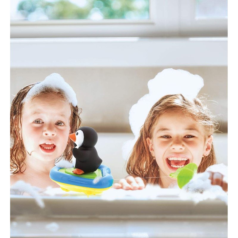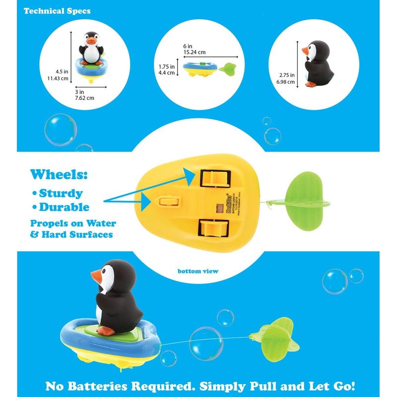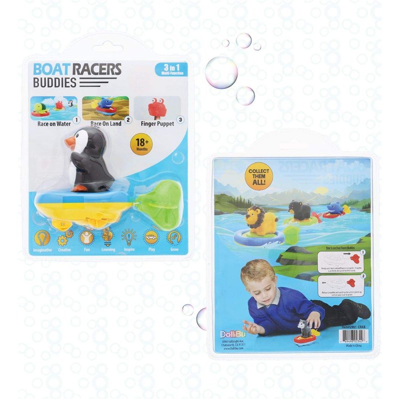 - 3 STIMULATING PLAYABLE MODES: Make bathtub time a splash with the Dollibu Penguin Bath Buddy Boat Racer. Pull the propeller string to wind up wheels, set it down, and watch it speed on land or water. Race against friends in the pool and the living room floor. Need a pit-stop? Let kids imagine the tub as the ocean, take the black and white Penguin off its boat, and enjoy finger puppet play! Boat racers are fast water toys sure to keep kids busy for hours while providing more than one way to play.