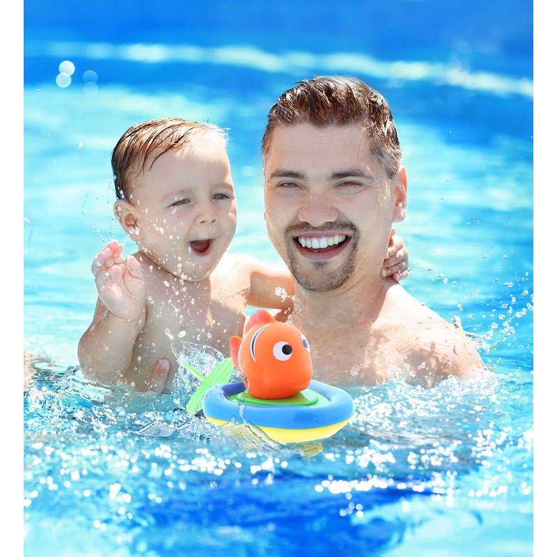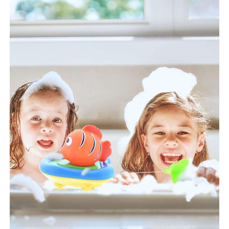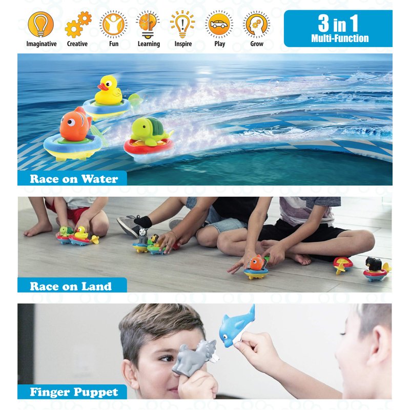 - FOR BATH TIME, POOL FUN AND FLOOR RACING: The perfect gift for toddlers and kids who love to race! Whether they play alone, race with friends and siblings, or imaginative play. 3 in 1 colorful windup racing toy is ideal for play dates, playtime, bath time, and fun games. Parents can use the Reef Fish finger puppet as a fun learning toy to encourage developmental and educational skills for toddlers like color recognition, sea animal names, and motor skills. Suits boys and girls 18 months and up.