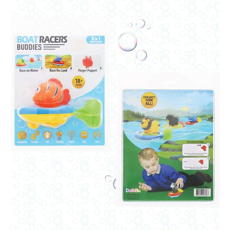 - 3 STIMULATING PLAYABLE MODES: Make bathtub time a splash with the Dollibu Reef Fish Boat Racer Buddy. Simply pull the propeller string to wind up wheels, set it down, and watch it speed on land or water. Race against friends in the pool and the living room floor. Need a pit-stop? Let kids imagine the tub as the ocean, take the orange reef fish off its boat, and enjoy finger puppet play! Boat racers are fast water toys sure to keep kids busy for hours while providing more than one way to play.