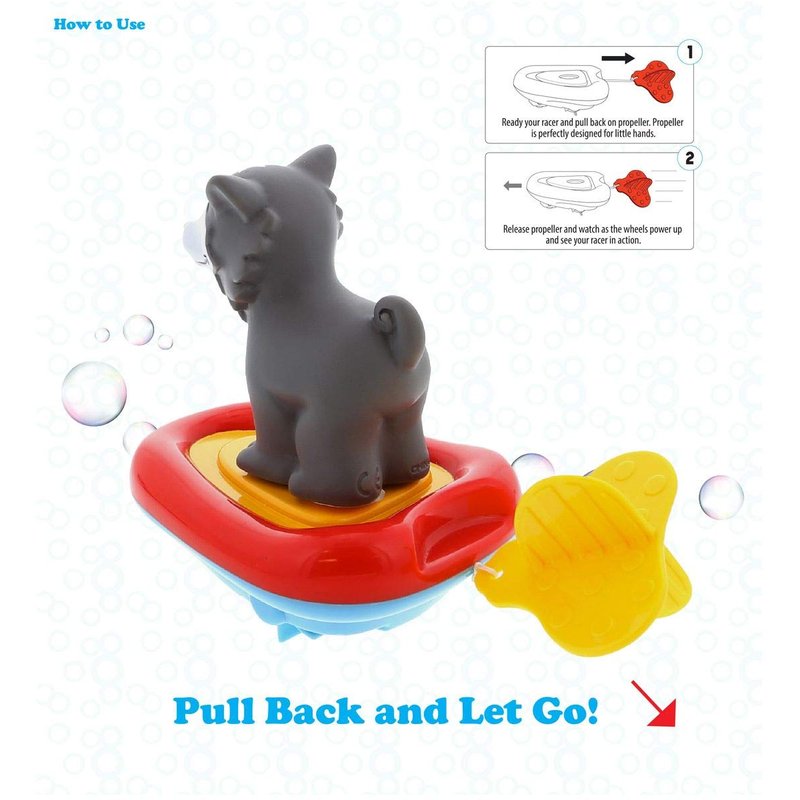 - 3 STIMULATING PLAYABLE MODES: Make bathtub time a splash with the Dollibu Wolf Bath Buddy Boat Racer. Simply pull the propeller string to wind up wheels, set it down, and watch it speed on land or water. Race against friends in the pool and the living room floor. Need a pit-stop? Let kids imagine the tub as the forest by taking the gray Wolf off its boat and enjoying finger puppet play! Boat racers are fast water toys that will keep kids busy for hours while providing more than one way to play.