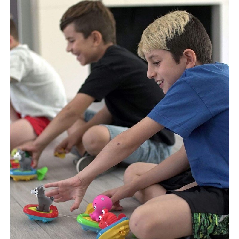 Ready! Set! GO! The Dollibu Wolf Boat Racer Buddy will be a big hit as it joins your little one for splashing fun in and out of the bath tub or pool. Motorized racing toy will run on any surface with its easy pull-and-go function – requiring no batteries. Simply pull the propeller string back to wind up the wheels, set the fast racer down, and watch ‘em go from floor to water for a photo finish. Great for toddlers and kids who love to race! Boat features 4 colors orange, blue, red, and yellow with a rubber gray wolf rider. Makes the perfect gift for Wolf lovers and young woodland explorers! Whether your toddler plays alone, race with friends and siblings, or imaginative play with parents, the toy’s 3-in-1 ways to play makes them the first rated choice for playdates, playtime, bath time, and adventures. Need a pit-stop? Let kids imagine the tub as the forest by taking the Wolf off its boat, and enjoy finger puppet play! The detachable gray Wolf and wind up boat can be played with separately for fun and games: swimming, running, crawling, and play. Watch it float! It’s no secret Boat Racer Buddies encourage developmental and educational skills for toddlers like color recognition, forest animal names, and motor skills. From baby bubble bath fun to kids playing with friends, multi-use boat racer will grow with your child. Collect 'em all for your toddler to mix-and-match. Buddies make the perfect party favors at zoo, safari, and carnival themed birthday! More characters available: bear, crab, duck, elephant, frog, lion, pig, and shark. Size: Boat 6"x3"x1.75", Wolf 3"x1.75"x3".