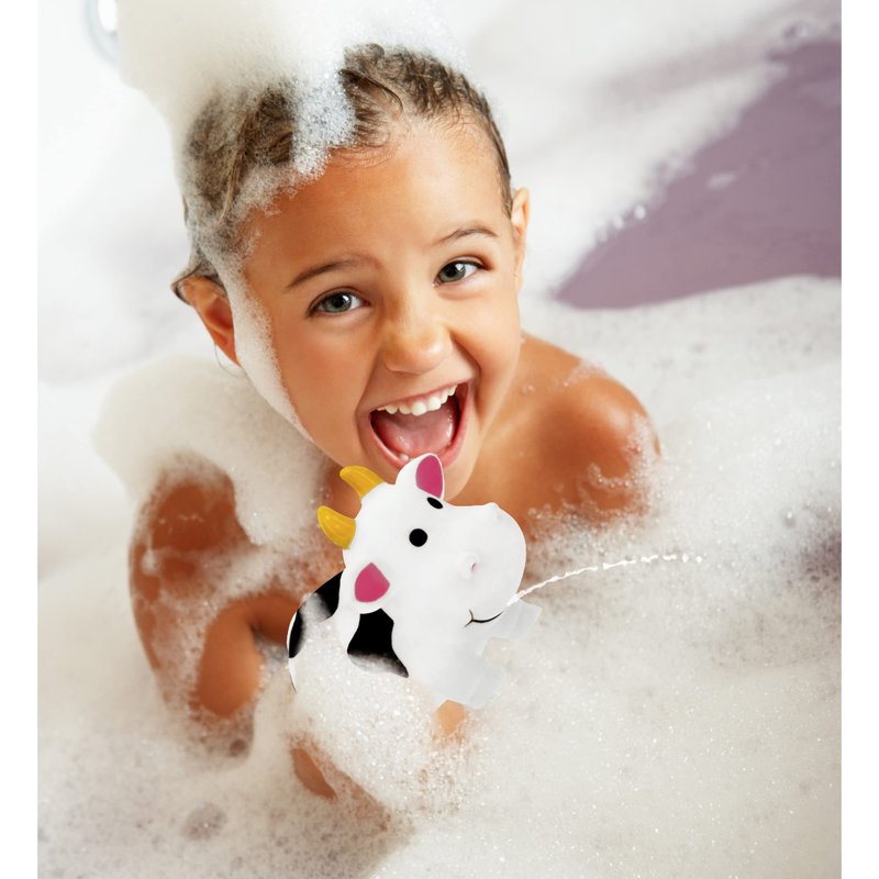 - INCLUDED WITH THE PURCHASE OF COW BATH TOY FOR KIDS - Includes 1 DolliBu White Cow Squirter Bath Toy for Kids. This bath cow toy features smooth, soft, and rounded edges to ensure the children's safety when bathing. Designed with realistic features of a cow animal farm toy, like its black spots. The adorable smiling cow figure bath toy shoots out water from a tiny hole when squeezed. This cool cow water toy measures 3.25Lx2.5Wx2.5H inches.