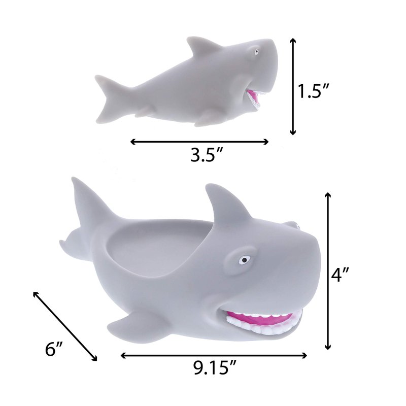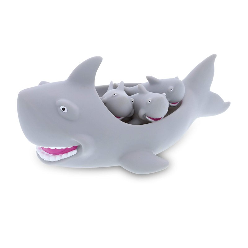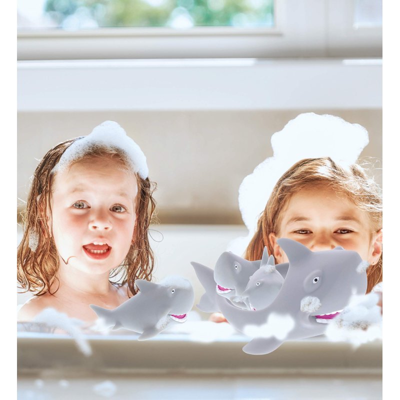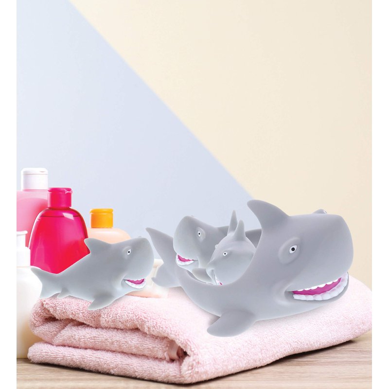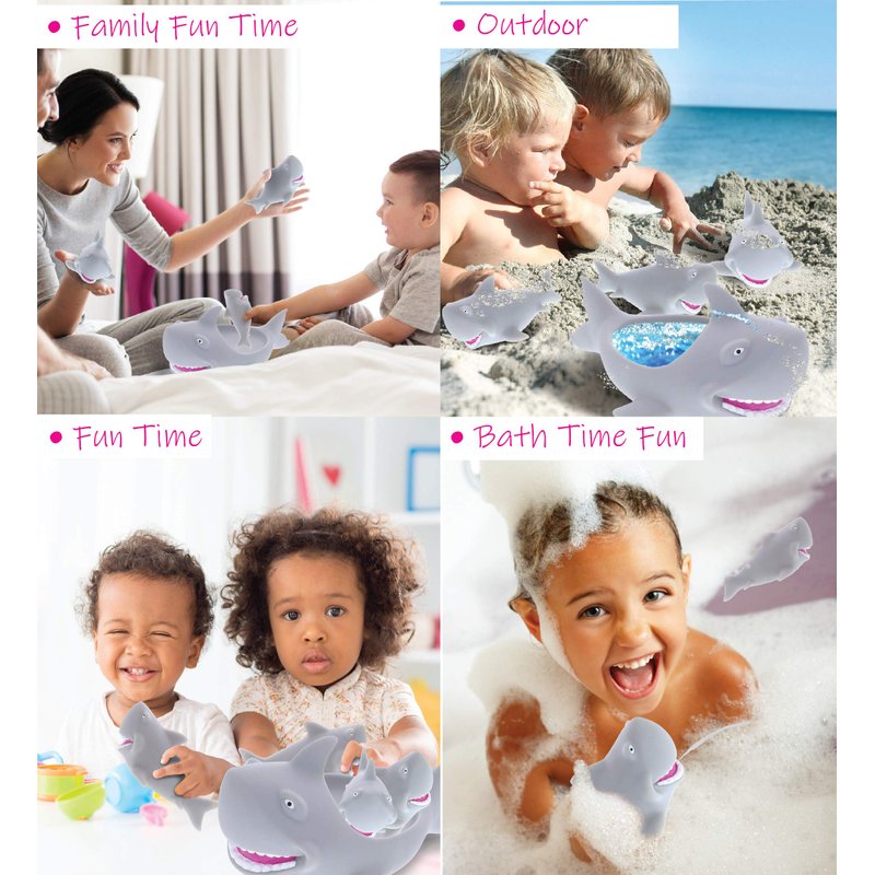 Dollibu Shark animal bath tub toys are great for educating little children and expanding their knowledge about animals. Cute animal bath tub toys or bathing toys that are excellent in educating little children about animals. Perfectly sized toys that can be played with in the bathtub or in the pool for endless fun, & can also be played outdoors during imaginative pretend play. Use as toy decor for an animal themed room or party, or educational accessories display for a classroom! An adorable family of sharks water toy set makes an easy, hassle gifts for little kids for any occasion. Water squirters are perfect bathroom toys for toddlers, & preschoolers who enjoy playing in the water. Designed for little boys & girls who love playing with animal figures. Bath squirter is a perfect water toy to play with siblings & friends. Perfect for parents who want to make bath time a fun, educational learning experience for their children. Includes 1 Dollibu Shark Animal Family Bath Squirters 4 piece set packaged inside a white mesh net. Smiling shark toys have cute cartoon eyes, fins & white teeth, and 3 smaller shark figures have a small hole in the middle of the mouth to squirt water from. The baby sharks are soft & fit perfectly on top of the firmer mama shark for easy storage! Animal Family Bath Squirters are made with strong & sturdy materials. Floating bathtub toys for toddlers made with durable yet lightweight rubber which makes it more safe & easier for children to play with in the shower or while enjoying a swim. Preserve the beauty of this cute bath squirter toy set by hand washing only & letting it completely dry up before the next use to prevent any build up. Add this cute & fun Shark family bath squirters set and start your child's bath toy collection! Big figure measures approx. 9.15"L x 6"W x 4"H and 3 smaller figures measure approx. 3"L x 2"H.
